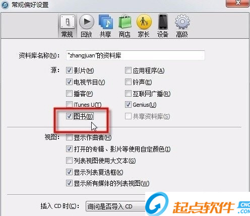 3、在“偏好設(shè)置”的“常規(guī)”一欄中,找到“源”里的“圖書”并勾選上;