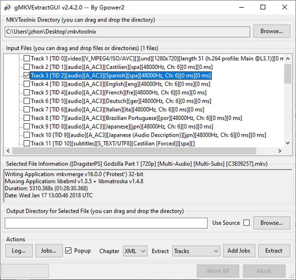 下載 gMKVExtractGUI 壓縮包回來后解壓縮到 MKVToolNix 目錄里再運行 gMKVExtractGUI.exe 就可以了將需要提取的 MKV 格式文件拖放到界面中,它就會自動讀取并列出里面的內(nèi)容,包括視頻、音頻、字幕、封面等。