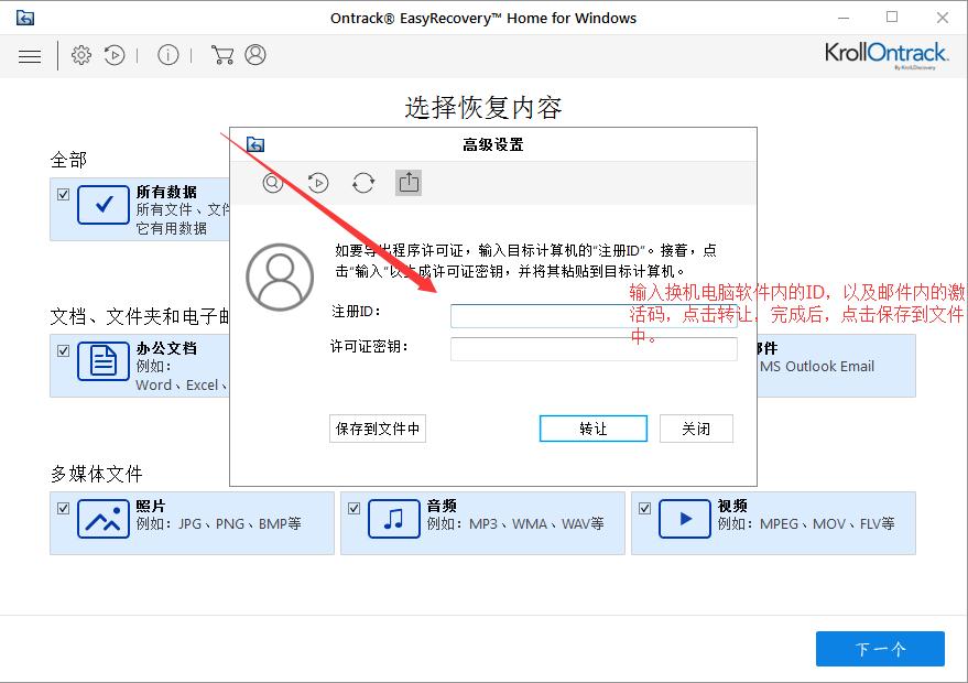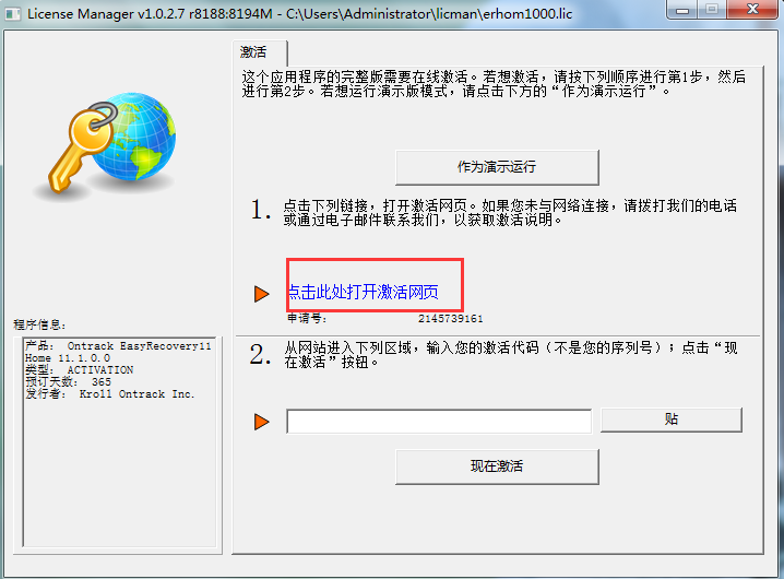 3.接著會彈出輸入許可證密鑰激活的窗口,這里的許可證密鑰要到源計(jì)算機(jī)上獲取,具體操作可參考:EasyRecovery 12如何換機(jī)使用。