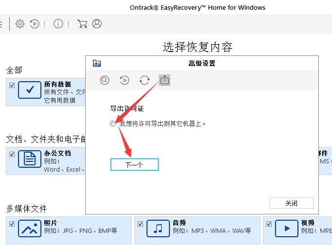 2.在打開的“高級設(shè)置”窗口中打開導(dǎo)出許可證選項(xiàng),勾選“我想將許可證導(dǎo)出到其它的機(jī)器上”,然后單擊“下一個”,如下圖所示。