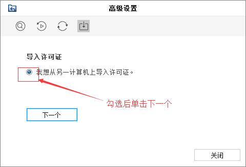 2.打開導(dǎo)入許可證選項(xiàng),勾選“我想從另一計(jì)算機(jī)上導(dǎo)入許可證”,然后單擊“下一個”,如下圖所示。