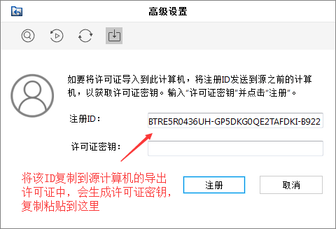 3.接著彈出如下圖所示的窗口,輸入注冊ID和許可證密鑰。這里的注冊ID是目標(biāo)計(jì)算機(jī)內(nèi)的ID,復(fù)制粘貼到這里,要獲取許可證密鑰,請單擊源計(jì)算機(jī)上的“轉(zhuǎn)讓”按鈕,此操作將生成許可密鑰。