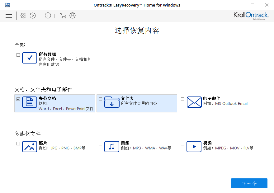 步驟一:選擇恢復(fù)內(nèi)容。打開已經(jīng)安裝好的數(shù)據(jù)恢復(fù)軟件 EasyRecovery 12 ,進(jìn)入第一個操作界面,我們可以看到這里要選擇恢復(fù)內(nèi)容,這里我們選擇恢復(fù)“辦公文檔”,點(diǎn)擊右下角的“下一個”。