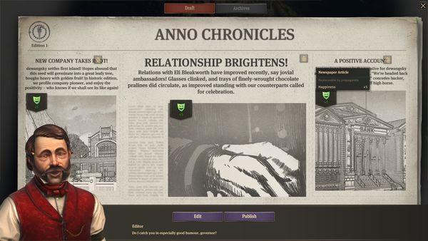 對(duì)內(nèi),本作加入了略有意思的報(bào)紙系統(tǒng),每隔一陣,玩家就有機(jī)會(huì)對(duì)輿論相關(guān)的報(bào)紙進(jìn)行“涂涂改改”,以此來(lái)維護(hù)自己的最大的利益,修改報(bào)紙會(huì)消耗的影響力點(diǎn)數(shù),這些點(diǎn)數(shù)也來(lái)自玩家通過(guò)穩(wěn)定運(yùn)行社會(huì)后得到的獎(jiǎng)勵(lì)點(diǎn)數(shù)。
