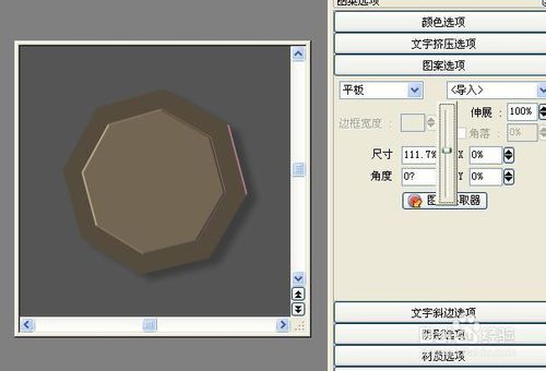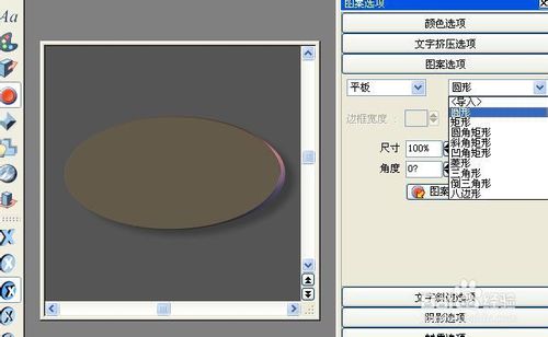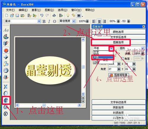 2、點(diǎn)擊xara 3d主界面左側(cè)的第三個(gè)平板按鈕,點(diǎn)擊“圖案選項(xiàng)”,點(diǎn)擊黑色的小三角,在下拉菜單中選擇“平板”。