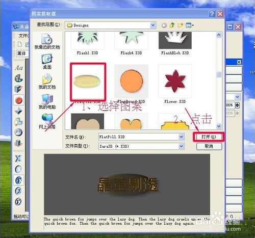 3、點(diǎn)擊“圖案提取器”,在新打開的圖案提取器對(duì)話框中,選擇一種你喜歡的圖案,選中,并點(diǎn)擊“打開”。