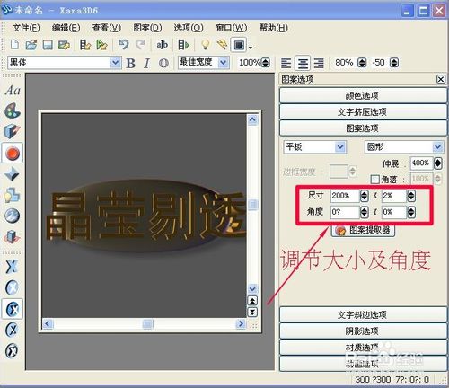 7、點(diǎn)擊右側(cè)圖案選項(xiàng)—調(diào)節(jié)尺寸,X調(diào)節(jié)文字左右方向,Y調(diào)節(jié)上下方向,角度調(diào)節(jié)旋轉(zhuǎn)方向,讓他們完美的重合