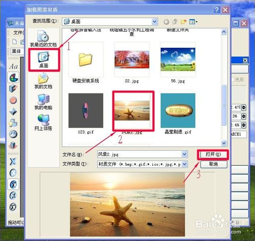 6、點(diǎn)擊“材質(zhì)”,在新打開的‘加載圖案材質(zhì)’對(duì)話框中,點(diǎn)擊“桌面”,找到那張海星的圖片,選中,點(diǎn)擊“打開”。