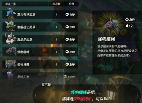 怪物馬具是需要在怪物商人吉爾頓處購(gòu)買,不過一開始玩家是找不到他的,需要先在東阿卡萊驛站的霍司塔處接任務(wù),然后他才會(huì)出現(xiàn)骷髏池塘。第一次對(duì)話沒法購(gòu)物,但是他會(huì)告訴你他可能出現(xiàn)的地點(diǎn),之后在那些地點(diǎn)都能隨機(jī)遇到他,到時(shí)候就可以購(gòu)買了(需要用材料兌換怪物幣,用怪物幣來購(gòu)物)。