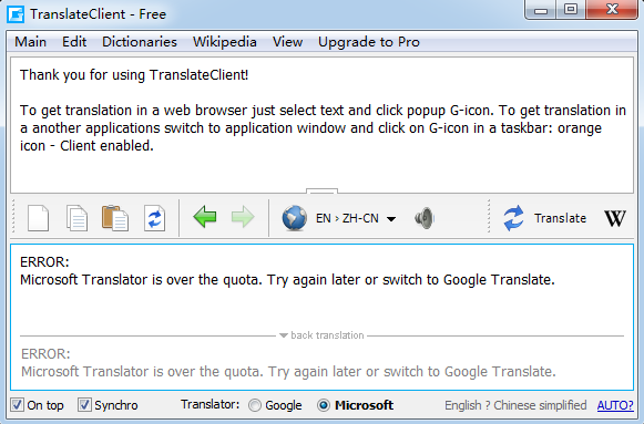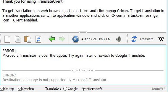Google Translate(谷歌翻譯器)是一款體積小巧、免費(fèi)、無插件的在線翻譯軟件,輸入你想要翻譯的內(nèi)容即可立馬得到翻譯。支持80種語言之間的即時(shí)翻譯,谷歌翻譯桌面工具還可以翻譯文件和保存翻譯結(jié)果,自動(dòng)監(jiān)視剪貼板復(fù)制即時(shí)翻譯,自動(dòng)緩存翻譯記錄方便查詢,支持34種語言的語音朗讀。Client for Google Translate總得來說,功能比較單一,只有翻譯功能,但是因?yàn)閱我?,又是依托于Google的翻譯,所以在翻譯上做的還是不錯(cuò)的,而且還提供所支持的任意兩種語言之間的字詞、句子和網(wǎng)頁(yè)翻譯。對(duì)于經(jīng)常來瀏覽國(guó)外網(wǎng)站的小伙伴來說,翻譯一些文章方面還是不錯(cuò)的,有需要的話千萬不要錯(cuò)過喲。