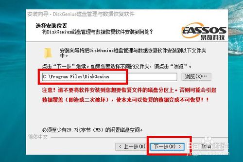 第四步:我們可以選擇軟件的安裝位置,但是軟件中提示不要安裝到我們要還原的硬盤上。