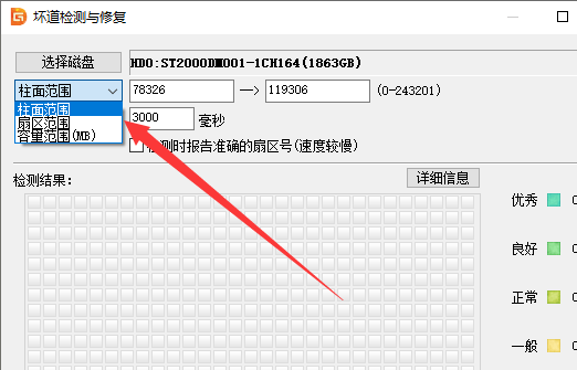 DiskGenius會彈出“壞道檢測與修復”窗口,如下圖: