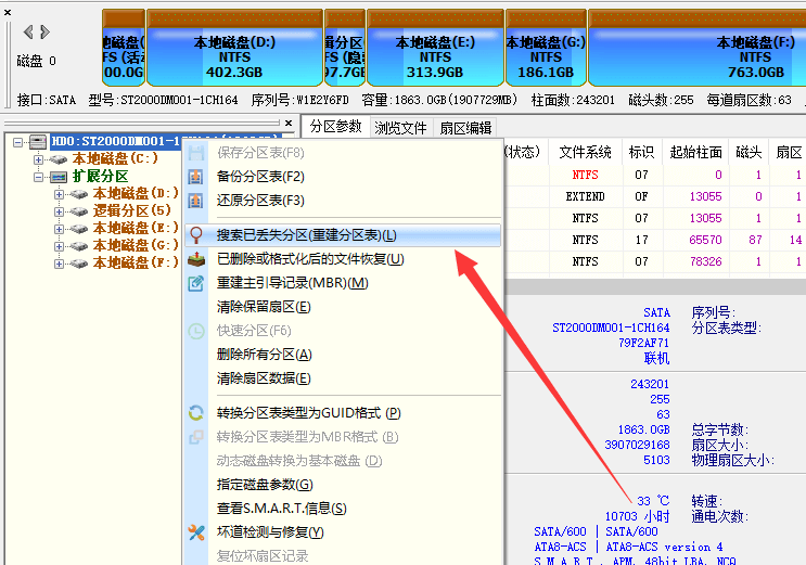 如上圖所示,選中要恢復數(shù)據(jù)的硬盤, 點擊鼠標右鍵,在彈出的快捷菜單中,選擇“搜索已丟失分區(qū)(重建分區(qū)表)”菜單項。