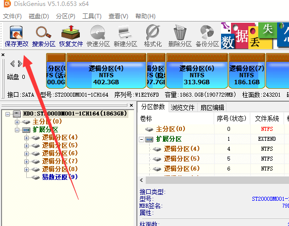 用戶確認要恢復分區(qū)的各種信息后,可以點擊工具欄最左側的“保存更改”按鈕,保存搜索到的分區(qū),如下圖: