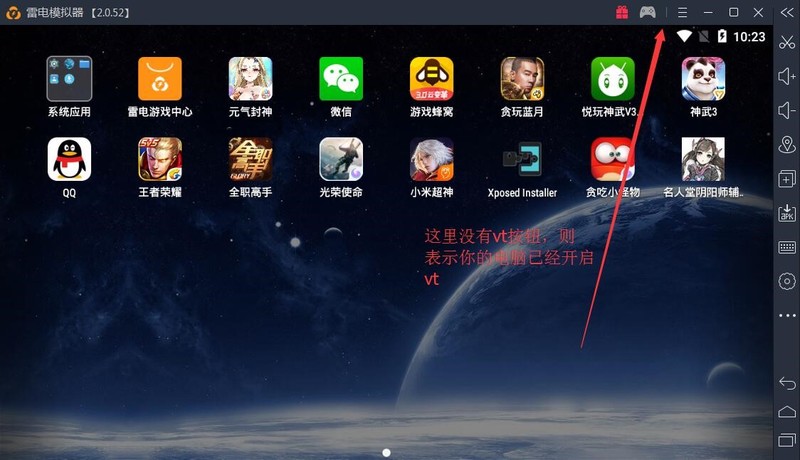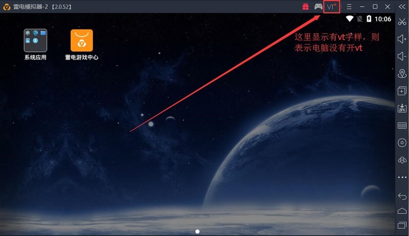 雷電模擬器怎么開(kāi)啟vt虛擬化技術(shù)?1、打開(kāi)雷電模擬器電腦版官方版,查看模擬器右上角,沒(méi)有顯示VT按鈕則是已經(jīng)開(kāi)啟了。