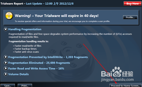 進入軟件首頁后會有一個磁盤的基本信息,包括注冊信息以及磁盤碎片的整理對于整體系統(tǒng)運行效率的提升等信息。我們要拖動進行整理,就點擊一下右下角的回到主界面按鈕。
