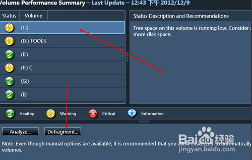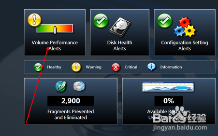 然后在主界面中,有一系列的磁盤選項,我們需要用的是拖動進行磁盤整理,就點擊第一個選項,即volume performance alerts 如圖所示。