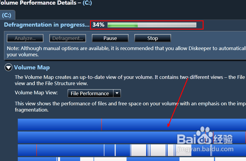 開啟Diskeeper程序主界面,在中間的 磁盤分區(qū)域中,可發(fā)現(xiàn)當前 主機所存在的各個磁盤分區(qū)。由于打算對某個分區(qū)進行 磁盤碎片整理,因此在選中該分區(qū)后,直接單擊“Defragment(碎片整理)”按鈕,就能夠?qū)λx分區(qū)進行碎片整理了。