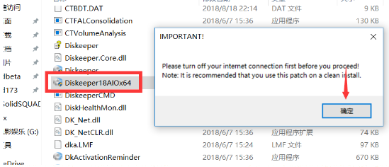 7、小編是64位系統(tǒng),將64位破解補丁Diskeeper18AIOx64復制到安裝目錄并運行,點確定(提示我們需要斷開網(wǎng)絡(luò),記得一定要斷開網(wǎng)絡(luò)) 默認:C:Program FilesCondusiv TechnologiesDiskeeper