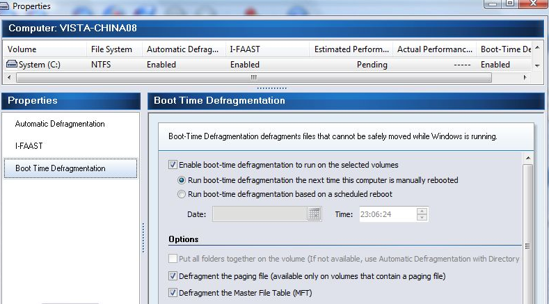 而倘若為存在 分頁文件或為NTFS 文件格式的分區(qū)執(zhí)行“啟動時碎片整理”這個功能時,那么還有更多的設(shè)置選項可供設(shè)定。在對 NTFS分區(qū)啟用“啟動時碎片整理”功能時,可勾選“對‘主文件表’(MFT)進行碎片整理”選項,即能啟用MFT碎片整理功能。