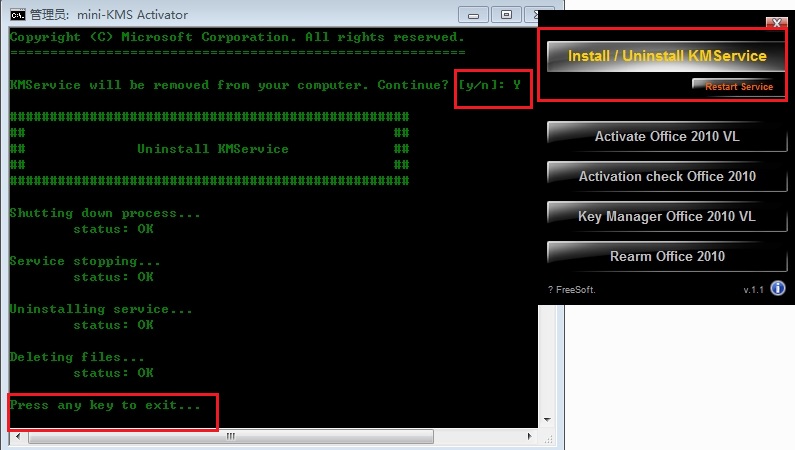 4、點(diǎn)擊“Install/Uninstall KMService”安裝“KMS”服務(wù)器。如下圖所示,在彈出的窗口輸入 Y ,安裝KMS服務(wù)器。安裝過(guò)程與結(jié)果如下圖所示,看到“Press any key to exit”,即表示安裝成功,這個(gè)時(shí)候隨便按一個(gè)鍵盤(pán),退出窗口。