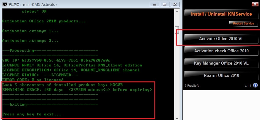 6、最后,點(diǎn)擊“Activate office 2010 VL”,即可成功激活,什么都不需要輸入,如下圖所示。會(huì)顯示180天的限制,不用擔(dān)心,到180天再次運(yùn)行這個(gè)正版激活工具,又是180天。