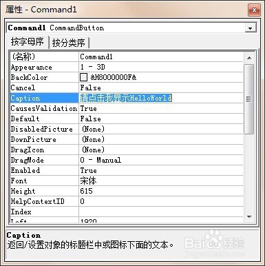 4、我們點擊command1,然后找到屬性面板中的Caption屬性。