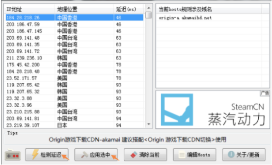 第三步:出現(xiàn)ip列表后,點(diǎn)擊【檢測延遲】;選擇延遲比較低的,再點(diǎn)擊【應(yīng)用選中】。需要注意的是:如果后面速度不理想,可以多換幾個(gè)IP試試!