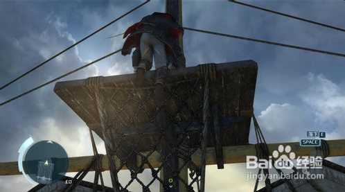 開啟鷹眼確定你的目標在對面貴賓席之上。之后從左邊的道路跳躍上,沿著左邊的看臺外延爬行前進