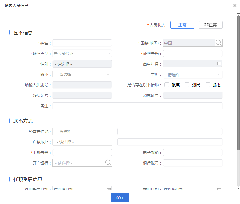 人員信息采集中,帶“*”號的都是必填信息,其他非必填信息,用戶可以根據(jù)實際情況選填。若相關信息不符合規(guī)范,在彈出相關提示時,需按照提示要求,更改相關信息為合法信息后,重新保存即可。