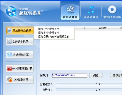 如下圖,是超級(jí)轉(zhuǎn)換秀“視頻轉(zhuǎn)換通”的主界面,除了對(duì)視頻的轉(zhuǎn)換和基礎(chǔ)編輯功能,超級(jí)轉(zhuǎn)換秀還支持進(jìn)行音頻轉(zhuǎn)換和編輯,CD抓軌,功能非常全面。軟件的界面也非常清新,即便是新手,也能順利看出條理。