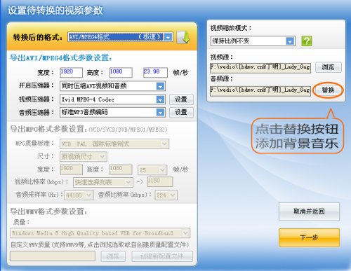 進(jìn)入“設(shè)置待轉(zhuǎn)換的視頻參數(shù)”對(duì)話框后,在“音頻源”旁邊點(diǎn)擊“替換”按鈕,然后選擇一個(gè)音頻文件導(dǎo)入,就成功給視頻添加一個(gè)背景音樂(lè)了,當(dāng)然,除了音樂(lè)文件,自己錄制的旁白,或者制作的音頻特效文件,都可以添加。