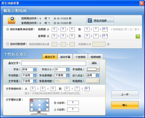 我們還可以將視頻最精彩的部分截取,并為視頻添加滾動(dòng)字幕、個(gè)性商標(biāo)、還有精美的視頻相框等功能。只需在“其它功能設(shè)置”對(duì)話框中即可輕松實(shí)現(xiàn)的。