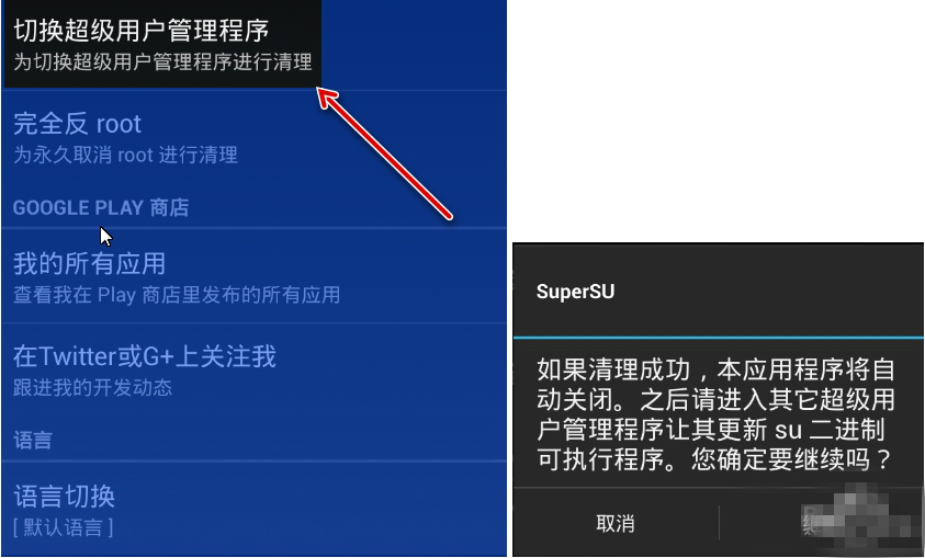 3、刪除 Root 完成后,再執(zhí)行一次【切換超級用戶管理程序】的操作,把 Supersu 清理掉。(沒有更新過Supersu的人不需要此操作)