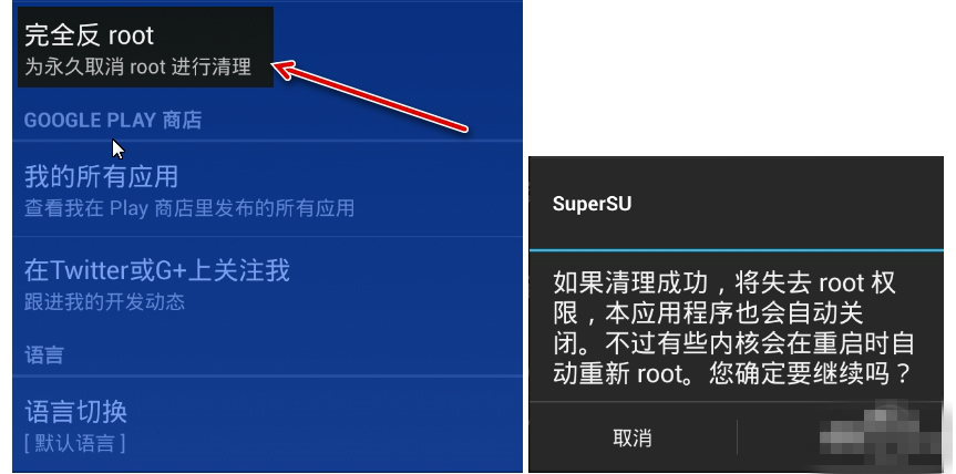 2、安裝完 Supersu 后,再次打開 Supersu 進入到設(shè)置中,執(zhí)行【完全反Root】功能。