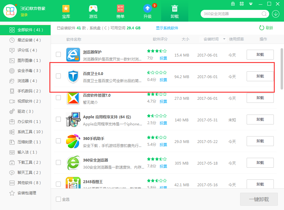 2、接著在軟件管家的“卸載”界面找到“百度衛(wèi)士”,之后點擊“卸載”并根據(jù)提示操作就可以卸載百度衛(wèi)士了。