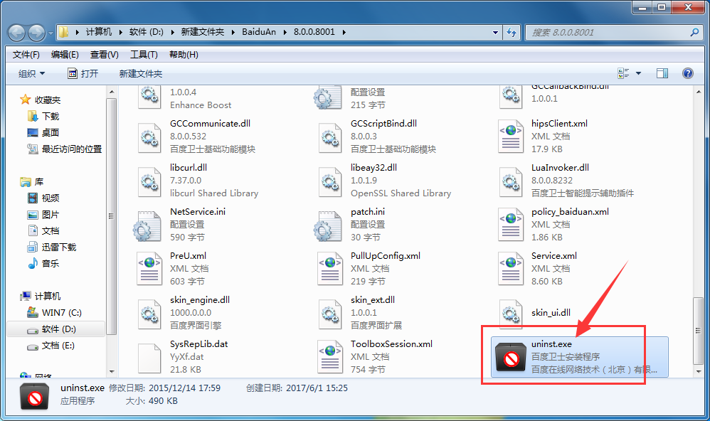 2、來到百度衛(wèi)士的安裝文件夾后,我們在里邊找到一個叫做“uninst.exe”的應用程序,之后雙擊運行它并根據(jù)提示操作即可卸載百度衛(wèi)士。