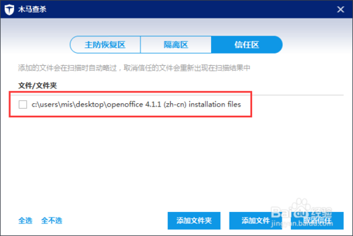 注意:設置到信任區(qū)的文件或文件夾一定要是自己知道這個文件的不是病毒。如果確認建議不要設置為信任文件。