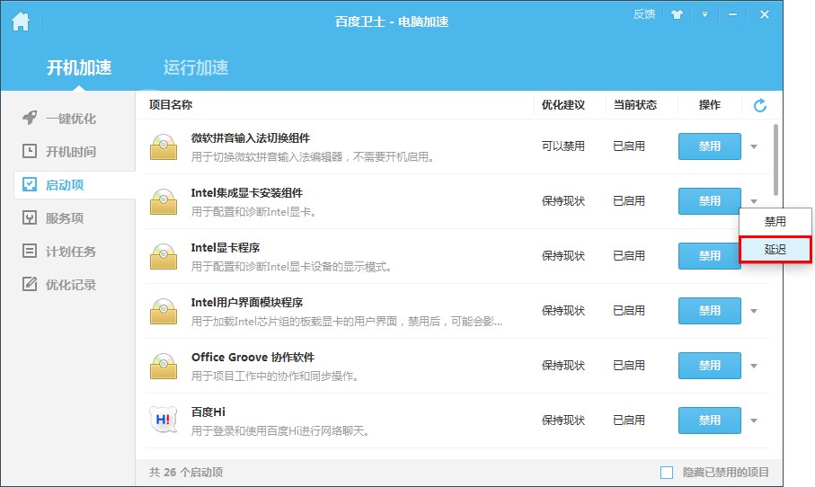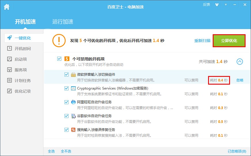 4.還可以通過電腦加速、系統(tǒng)清理、木馬查殺和軟件管理四大服務精確地優(yōu)化電腦各項問題。電腦加速通過禁用或延遲啟用開機項達到開機加速的效果,同時提供默認的高速模式和可選的極速模式提升電腦運行速度