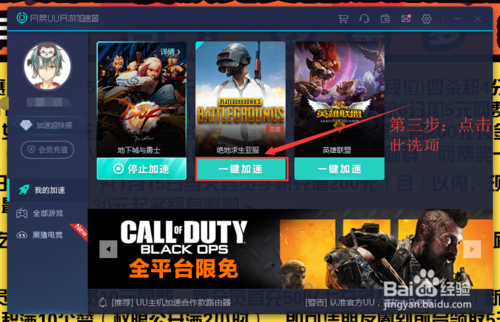 加速器吃雞路徑設(shè)置步驟三:完成游戲的添加以后,返回程序首界面,點(diǎn)擊首界面游戲下方的“一鍵加速”。