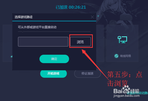 加速器吃雞路徑設(shè)置步驟五:點(diǎn)擊“設(shè)置游戲路徑”選項(xiàng)以后,界面上會(huì)顯示一個(gè)彈窗。點(diǎn)擊彈窗上的“瀏覽”選項(xiàng)。