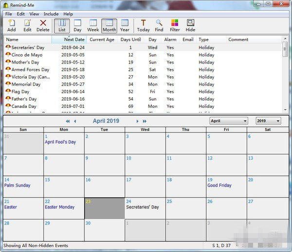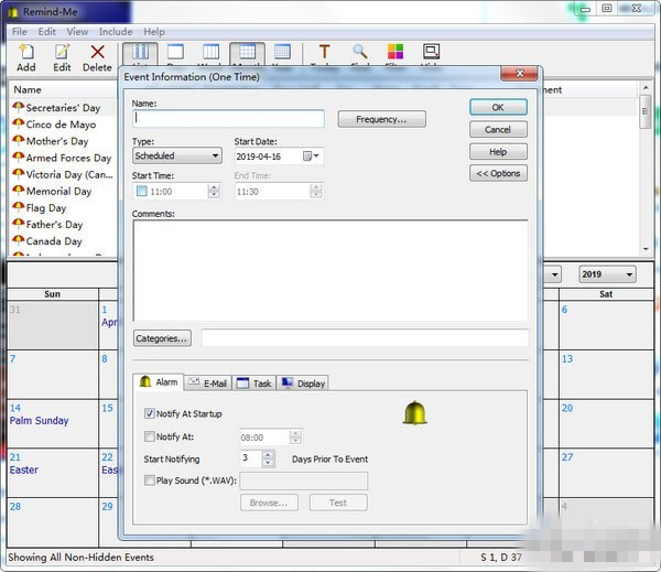 1、有提醒 - 當(dāng)你的電腦啟動(dòng)時(shí),我開(kāi)始隱藏在你的托盤(pán)中。使用菜單命令“文件/選項(xiàng)...”在“啟動(dòng)”選項(xiàng)卡下指定此選項(xiàng)。2、請(qǐng)注意,Remind-Me的任務(wù)托盤(pán)圖標(biāo)顯示當(dāng)月的當(dāng)天,以便于快速參考。