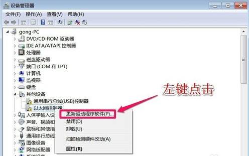 5、右鍵點擊網(wǎng)卡設(shè)備→更新驅(qū)動程序→指向光驅(qū)中的驅(qū)動程序光盤→按照提示完成更新即可。