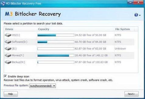 1、恢復(fù)丟失Bitlocker分區(qū):可對丟失的Bitlocker分區(qū)進(jìn)行恢復(fù),如:分區(qū)無法被系統(tǒng)找到,未能顯示;分區(qū)顯示,但無分區(qū)的相關(guān)信息等。