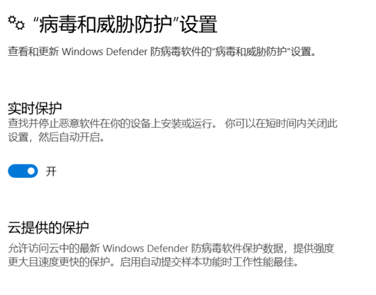在“病毒和威脅防護(hù)”設(shè)置界面,關(guān)閉“實(shí)時(shí)保護(hù)”,關(guān)閉“云提供的保護(hù)”,關(guān)閉“自動(dòng)提交樣本”這三項(xiàng)。