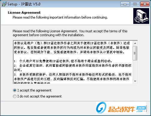 1.進(jìn)入IP雷達(dá)的安裝向?qū)?。閱讀軟件的許可協(xié)議,閱讀完成之后點(diǎn)擊I accept the agreement我接受協(xié)議。必須接受協(xié)議才能繼續(xù)安裝軟件;