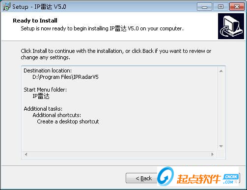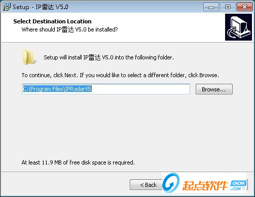 2.安裝向?qū)J(rèn)設(shè)置的軟件默認(rèn)安裝路徑為C:\Program Files\IPRadarV5。安裝軟件至少需要11.9MB的空閑磁盤空間。點(diǎn)擊Browse瀏覽按鈕可以在文件夾瀏覽窗口中自定義設(shè)置軟件安裝路徑;