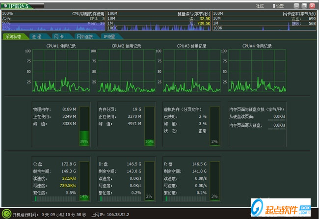 2、網(wǎng)絡(luò)流量監(jiān)測IP雷達(dá)實(shí)時顯示系統(tǒng)狀態(tài),CPU,內(nèi)存,磁盤讀寫,磁盤空間使用狀態(tài)。