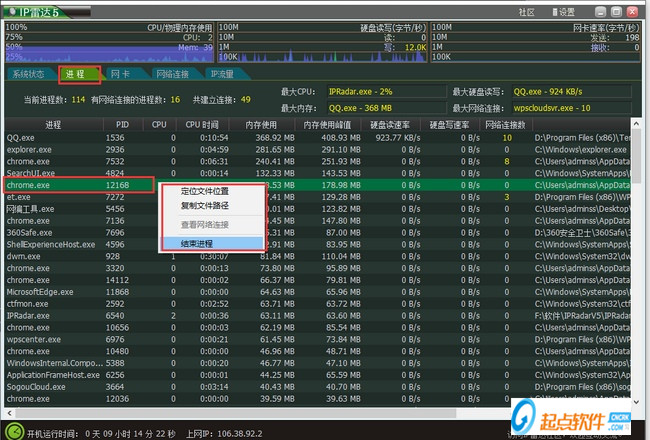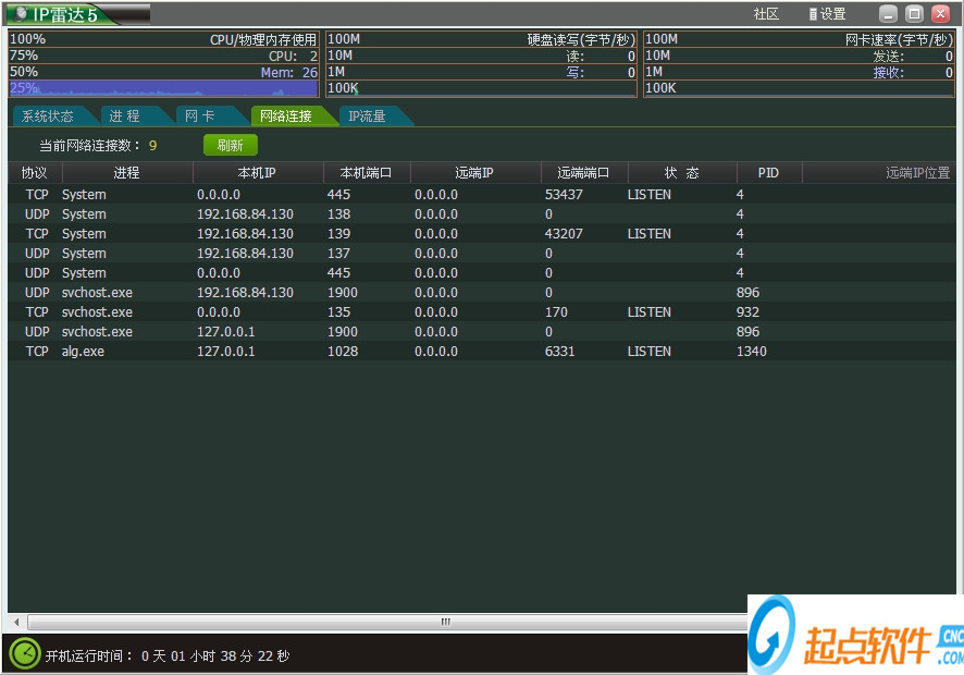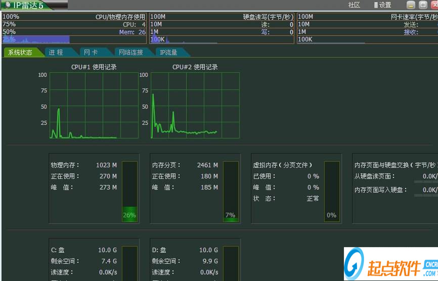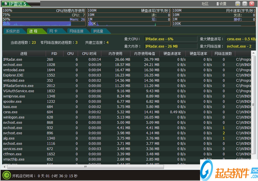 1、首先在本站下載安裝好網(wǎng)絡(luò)流量監(jiān)測IP雷達(dá)軟件后,打開進(jìn)入軟件主界面,如下圖所示界面有系統(tǒng)狀態(tài)、進(jìn)程、網(wǎng)卡、網(wǎng)絡(luò)連接和IP流量功能選項(xiàng),在界面還有詳細(xì)的CPU、物理內(nèi)訓(xùn)等信息,用戶可以進(jìn)行查看。