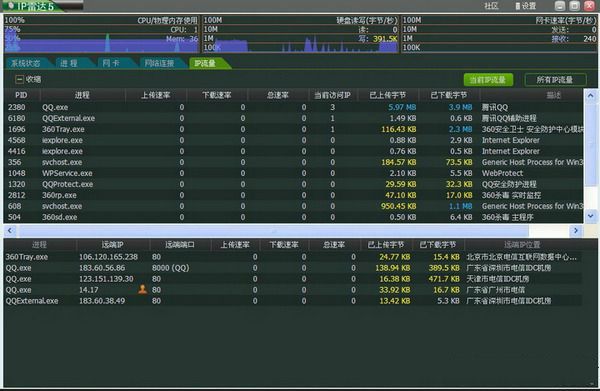 4、最后用戶可以點(diǎn)擊IP流量選項(xiàng),然后可在在界面中看到應(yīng)用程序的的流量,從下圖可以看出信息很詳細(xì),有當(dāng)前IP流量和所有IP流量,用戶可以點(diǎn)擊查看,如果想要關(guān)閉其中的一個進(jìn)程,所標(biāo)右鍵點(diǎn)擊選擇結(jié)束進(jìn)程就可以了。